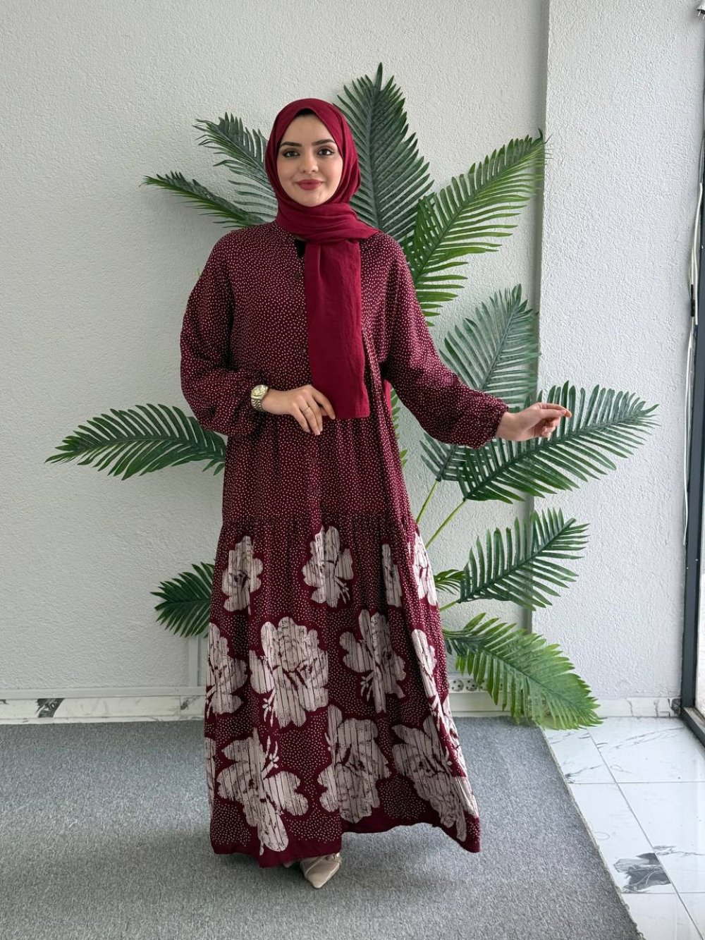 Asalet desenli viskon elbise Bordo