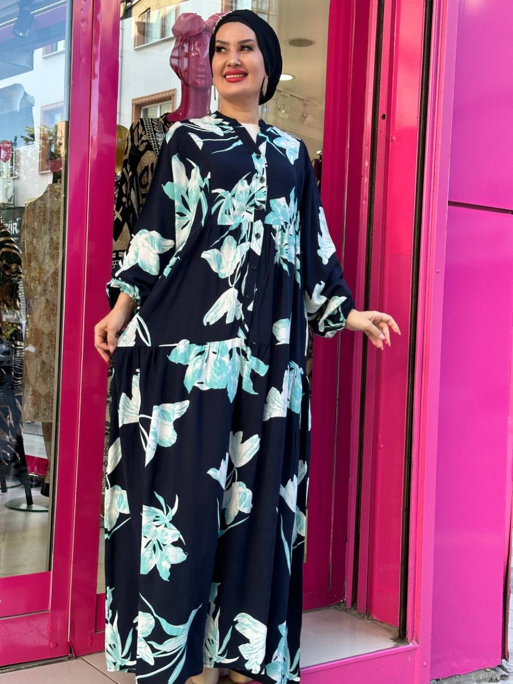 ŞAHSULTAN DESENLİ VİSKON ELBİSE Mavi