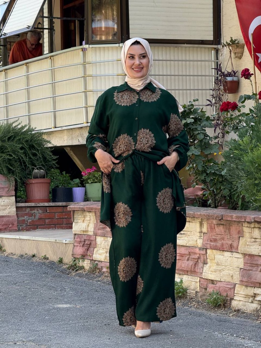 Modern zarafet ve klasik desenin buluştuğu Nazlı Zerafeti Tunik & Pantolon Takımı, rahat kalıbı ve dökümlü viskon kumaşıyla gün boyu konfor sunarken, stilinize şıklık katıyor.